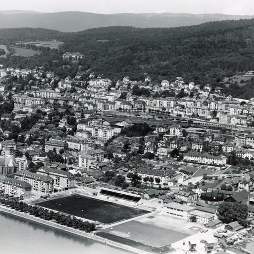 En 1956, un avion survole le lac de Neuchâtel pour capturer une vue aérienne de la ville. Sur cette photographie, on distingue l’ancien stade de football du Club Cantonal, qui deviendra le Neuchâtel Xamax en 1970. À droite, la halle de gymnastique de Pierre-à-Mazel se dresse, laissant entrevoir la cheminée de l’usine à gaz, démolie en 1967 pour faire place à l’actuel Centre de formation professionnelle neuchâtelois (CPNE). Enfin, le bâtiment originel de l’Hôpital Pourtalès complète cette zone qui a profondément changé en 70 ans.