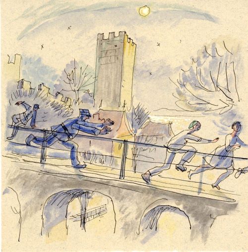 En 1982, le dessinateur Marcel North (1909–1990) illustre l’ouvrage publié pour les 150 ans de la Société de Belles-Lettres de Neuchâtel. L’un de ses dessins montre des Bellettriens, alors en pleine escapade romantique, poursuivis par la police dans les Jardins du Prince, dans un décor dominé par la Tour des Prisons et illuminé par la Lune.