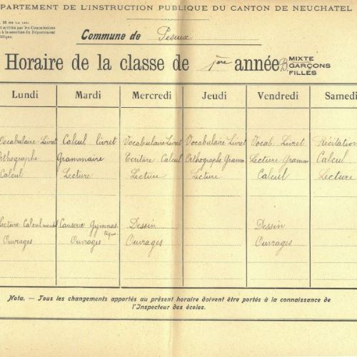 À partir de 1886, l’inspecteur cantonal Léon Latour (1853–1920) visite chaque année les écoles enfantines et primaires du canton. Il observe les classes, note la fréquentation et le respect des programmes. Vers 1909, pour les écoles de Peseux, il annote un horaire hebdomadaire où l’on voit que les élèves suivaient des cours le samedi matin, notamment de lecture et d’arithmétique. Ce n’est qu’au début des années 1970 que la semaine de cinq jours commence à se généraliser dans les communes neuchâteloises, à l’issue de débats animés entre enseignants, parents et autorités politiques.