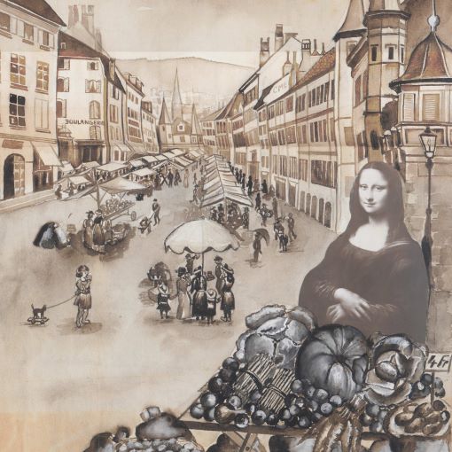 En 1912, Emmanuel Borel (1891-1974) donne une conférence humoristique à ses collègues de l’Union commerciale, fondée en 1875 et aujourd’hui basée au Coq d’Inde. Il y raconte un voyage imaginaire à « Britschonville » (Neuchâtel), parodiant les récits d’explorateurs. Il tourne en dérision l’architecture, les coutumes locales et les « Britschons », qui auraient, selon lui, mis « un dindon sur leur drapeau » – clin d'œil moqueur à l’aigle des armoiries de la Ville. Sa présentation, illustrée de dessins satiriques, montre notamment la Joconde vendant des légumes sur la place du Marché, preuve que les détournements de la célèbre œuvre de Léonard de Vinci ne datent pas d’Internet !