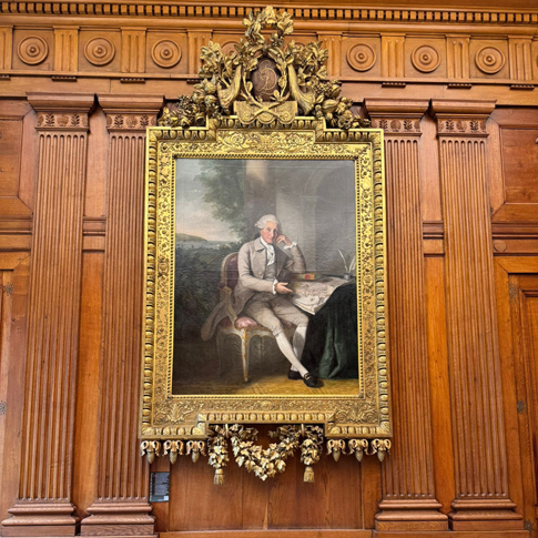 "Exécuté par l’Irlandais Thomas Hickey, ce portrait orne cette salle depuis l’inauguration de l’Hôtel de Ville en 1790. Son riche cadre devait à l’origine accueillir un portrait royal. Cet honneur est à la hauteur de la reconnaissance de la ville, héritière de la fortune colossale de David de Pury, qui permettra d’importants travaux d’intérêt public, dont l’Hôtel de Ville.