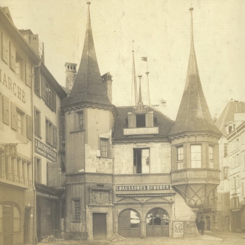 Les Archives de la Ville ont le plaisir de vous présenter les rues des Terreaux et de l’Hôtel-de-Ville, photographiées vers 1860-1861, probablement depuis le toit de l’Hôtel Bellevue (Rue du Musée 1 aujourd’hui). On y voit la Bijouterie Mayer, active jusqu’en 1863, dans le bâtiment de l’Hôtel des Alpes (actuelle tour Axa). La Tour des Chavannes se dresse encore fièrement à l’entrée du centre-ville historique, avant d’être démolie en 1867 sur décision des autorités. Deux nouveaux réverbères à gaz trônent devant l’Hôtel de Ville, cette technologie d’éclairage a été installée en ville en 1859 avec l’inauguration de l’usine à gaz dans le quartier de la Maladière cette année-là. Les échafaudages sur la maison du Concert témoignent des travaux entrepris en 1861 pour élargir la façade est.