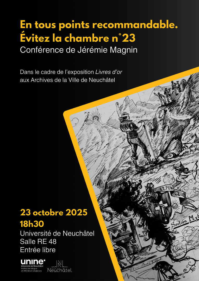 Jérémie Magnin, doctorant à l’Université de Neuchâtel, donnera une conférence intitulée « En tous points recommandable. Évitez la chambre n° 23 », le 23 octobre 2025 à 18h30, en salle RE 48 de la Faculté des lettres. Il y présentera ses recherches sur les registres de voyageurs dans les hôtels suisses au XIXe siècle. Avec l’essor du tourisme de masse à cette époque, ces documents ne se limitent pas seulement à une fonction administrative : ils deviennent aussi des livres d’or ou un espace d’expression pour les clients. On y trouve dessins, recommandations, éloges ou critiques liés à leur séjour. Ces micro-récits, entre anecdotes personnelles et commentaires plus convenus, offrent un aperçu vivant et contrasté de la Suisse touristique.
