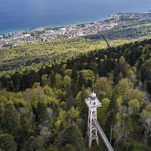 Au départ de La Coudre, le funiculaire coloré de Chaumont traverse l’épaisse forêt de sapins jusqu’à la station supérieure. A l’arrivée, une passerelle conduit jusqu’à la Tour panoramique qui culmine à près de 1200 mètres d’altitude. Construite en 1912, elle offre une vue imprenable sur les lacs de Neuchâtel, Bienne et Morat. Par beau temps, le panorama s’étend jusqu’aux sommets enneigés des Alpes. Accessible à l’année, la Tour de Chaumont est également dotée d’un phare, dont la lumière orange clignote en cas de tempête.