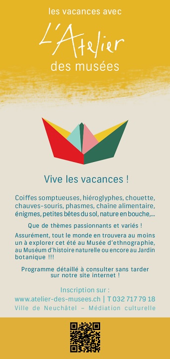 |  | L'été arrive... C'est génial !!!L'heure a donc sonnéavec de super chouettes ateliers... le nombre de places étant limité !!! Au plaisir de vous accueillir avec gaieté... L'équipe de l'Atelier des muséesService de la culture - Médiation culturelle