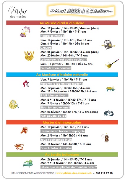 |  | BONJOUR ! 2021 va doucement tirer sa révérence...Bienvenue à 2022 un p'tit peu en avance ! Et pour vous préparer à changer d'annéeVoici déjà les ateliers de janvier et février ! Le nombre de places étant limité,N'attendez pas le réveillon pour vous annoncer ! Toute l'équipe se réjouit de vous retrouver en 2022... L'Atelier des musées - Médiation culturelle de la Ville de Neuchâtel