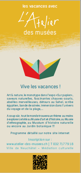 |  | Bonjour ! Le mois de juin est déjà bien entamé...Ce sera tout bientôt... l'été !!! Il est donc temps de penser à des vacances animéesen participant à l'un ou l'autre de nos supers ateliers !!! Jetez vite un oeil à notre programme détaillé : puis inscrivez-vous sans plus tarder !!! Nous nous réjouissons d'ores et déjà beaucoup de vous accueillir nombreuxpour des moments privilégiés, créatifs, passionnants, dépaysants, savoureux... A très bientôt !!! L'équipe de l'Atelier des muséesVille de Neuchâtel - Médiation culturelle