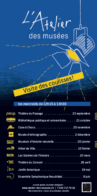 |  | Bonjour ! Mercredi prochain débute officiellement la saison 2020-2021des toujours très prisées visites des COULISSESdes institutions culturelles de la Ville de Neuchâtel ! C'est le Théâtre du Passage qui ouvre les feuxd'une série de 10 rendez-vous passionnants. Le nombre de places étant limité, n'attendez pas pour réserver votre place ! Toutes ces institutions se réjouissent de vous accueilliret de vous faire découvrir leurs espaces cachés... A bientôt ! L'Atelier des muséesService de la médiation culturelle de la Ville de Neuchâtel