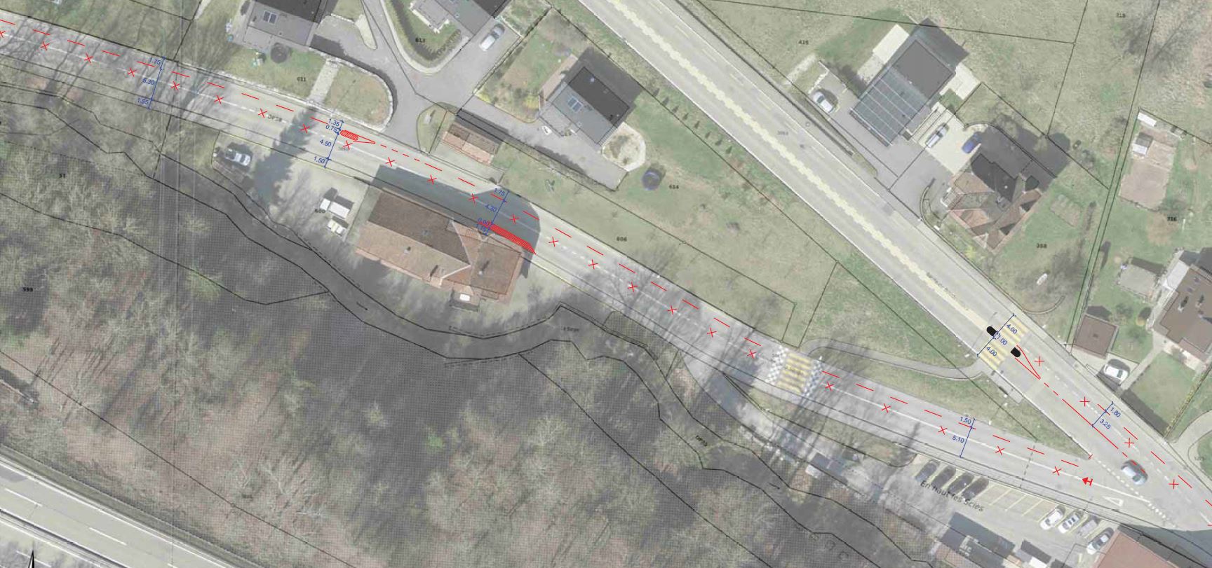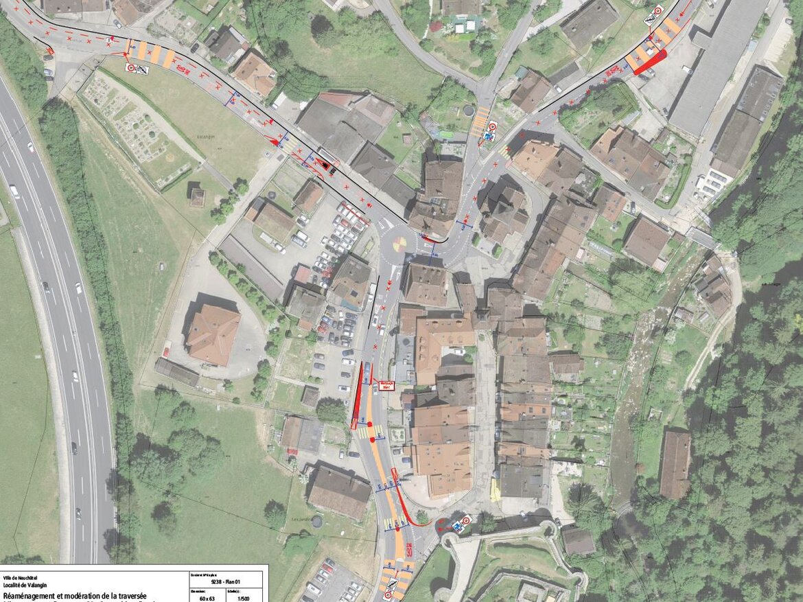 Le projet prévoit la mise en place de mesures minimales telles que du marquage et de la signalisation verticale. La réalisation de travaux de génie civil se limitera à quelques mises en conformité ponctuelles de courts tronçons de trottoirs notamment pour les personnes à mobilité réduite. Ces petits travaux prennent en compte plusieurs demandes citoyennes qui ont été relayées auprès de la déléguée au quartier de Valangin. Les quais de l’arrêt de bus « Valangin, centre » seront mis aux normes LHand comme l’exige la Confédération.
