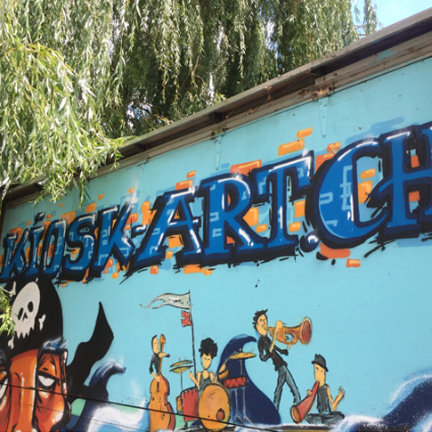 Au bord de l’eau, Kiosk-Art propose des concerts, mais aussi des moments d’échange et de rencontre. Lieu de culture convivial et populaire, l’association promeut des artistes de tous horizons en leur donnant la possibilité de s’installer, d’exposer et de se produire sur scène. La caravane fixe est ouverte par beau temps seulement.