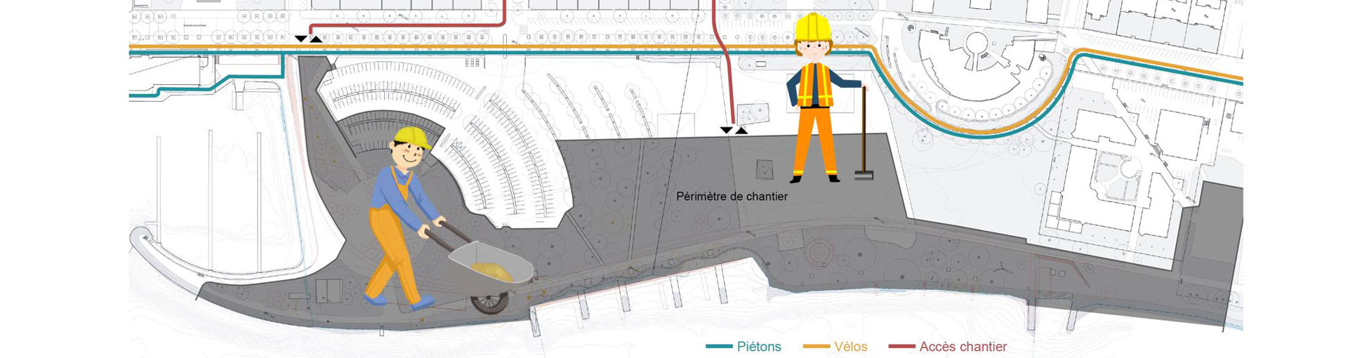 Eté-automne 2025: l'aménagement des rives (secteur 1) est terminé, la construction du restaurant et du café-bain sont en cours et devraient être achevés pour l'été 2026. Suivez les étapes de la construction sur cette page.
