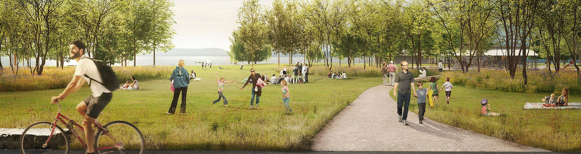Le nouveau parc des Jeunes-Rives va offrir davantage de surfaces vertes le long des rives. À terme, les plantations des 300 mètres de rive nouvellement aménagée seront complétées selon un rythme irrégulier laissant des percées visuelles sur le lac et les Alpes au fil de la promenade.