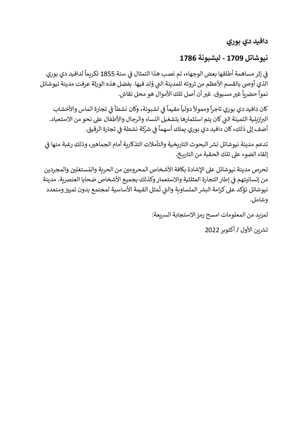 A Cidade de Neuchâtel deseja prestar homenagem a todos aqueles que foram privados da sua liberdade, explorados e desumanizados no contexto do comércio triangular e da colonização, bem como aos que ainda hoje são vítimas de racismo. Ela afirma a mesma dignidade humana, e o valor essencial de uma sociedade sem discriminação, plural e inclusiva.