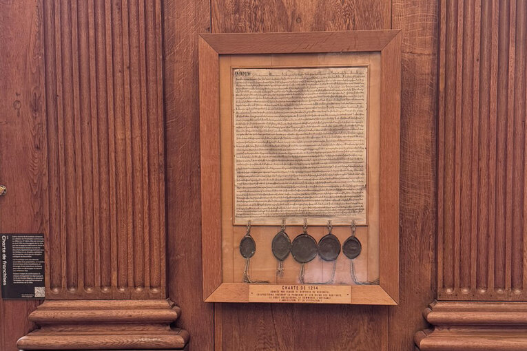 Tout récemment, des cartels explicatifs ont été installés pour mieux faire connaître l'histoire de ces éléments qui ornent la salle de la Charte. Vous en trouverez le contenu ci-dessous.