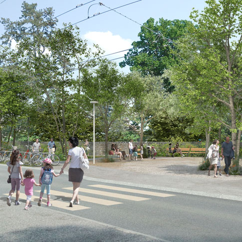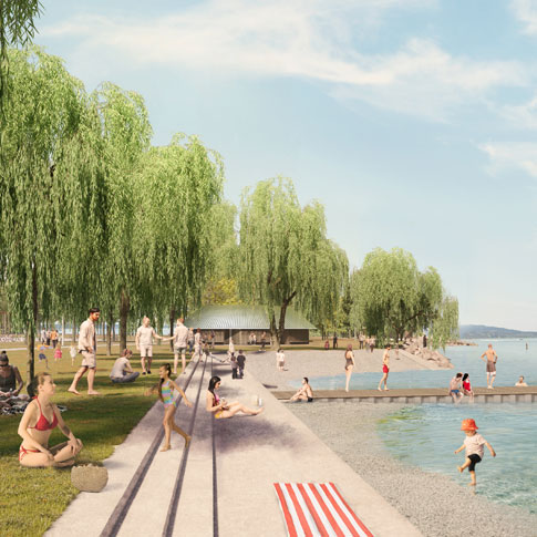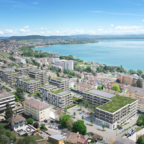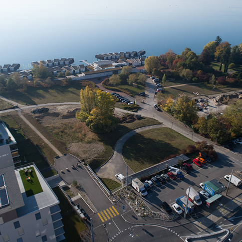 Le projet "Les Gouttes d'Or" comprendra des services de proximité, des voies de mobilité douce ainsi qu'un espace vert généreux et public. Pour profiter des rives, il suffira de descendre du bus et de traverser le parc en direction du lac, tout en s'approvisionnant à l'épicerie ou en s'attablant à la terrasse d'un café.