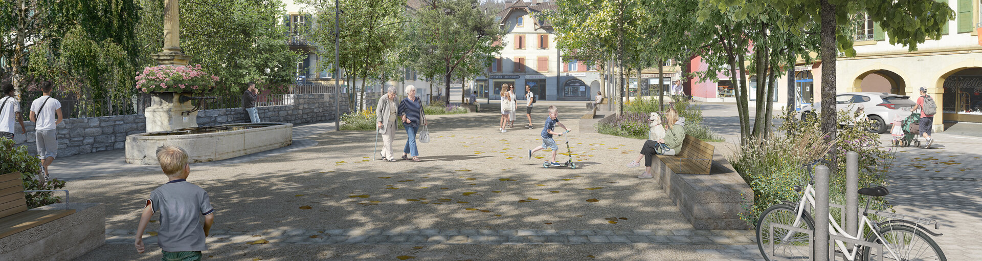 Installation d’un réseau de chauffage à distance (CAD) et le réaménagement de la place de la Fontaine, réalisés par phases.