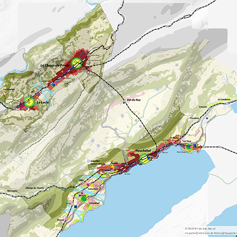 Basé sur la vision d’une agglomération unique mais non-contiguë et organisé autour des deux pôles urbains de la Région Neuchâtel Littoral et de l’agglomération urbaine du Doubs (AUD), le projet d’agglomération réunit et coordonne une stratégie de développement territorial au sens large qui donne corps au schéma d’agglomération (en photo). Il définit un système multipolaire rendu possible par le RER neuchâtelois en concentrant le développement de l’urbanisation dans les centres, notamment en ville de Neuchâtel.